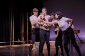 Mayr gibt den Kontrahenten viel Raum zur Gegenüberstellung ihrer Haltungen und verzichtet darauf, das diskursive Stück mit aktionsgeladener Ideen aufzupeppen. Sie konzentriert die Aufmerksamkeit auf die Inhalte. Wer sich darauf einlassen mag, erlebt ein spannendes Stück über Macht, Ideologie und Manipulierbarkeit und darf sich überraschen lassen, wie modern Büchner immer noch ist. Zum Schluss stehen alle wieder da und sprechen ihren Text vom Beginn noch einmal. Doch jetzt nicht mehr in einer Reihe vor dem geschlossenen Samtvorhang, sondern vereinzelt und verteilt über die ganze Bühne. "Was ist das, was in uns lügt, mordet, stiehlt?" Dann ein lauter Knall, das schwarze Loch auf der Bühne hat sich geschlossen. Die Visionen Dantons und Camilles sind der Guillotine zum Opfer gefallen. (Foto: Sinje Hasheider)