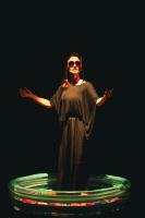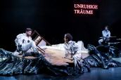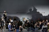 Mayr gibt den Kontrahenten viel Raum zur Gegenüberstellung ihrer Haltungen und verzichtet darauf, das diskursive Stück mit aktionsgeladener Ideen aufzupeppen. Sie konzentriert die Aufmerksamkeit auf die Inhalte. Wer sich darauf einlassen mag, erlebt ein spannendes Stück über Macht, Ideologie und Manipulierbarkeit und darf sich überraschen lassen, wie modern Büchner immer noch ist. Zum Schluss stehen alle wieder da und sprechen ihren Text vom Beginn noch einmal. Doch jetzt nicht mehr in einer Reihe vor dem geschlossenen Samtvorhang, sondern vereinzelt und verteilt über die ganze Bühne. "Was ist das, was in uns lügt, mordet, stiehlt?" Dann ein lauter Knall, das schwarze Loch auf der Bühne hat sich geschlossen. Die Visionen Dantons und Camilles sind der Guillotine zum Opfer gefallen. (Foto: Sinje Hasheider)