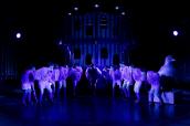 Erst als sich die Drehbühne ein letztes Mal dreht, alle Personen wie erschlaffte Puppen an Platanow vorbeiziehen und ein riesiges Loch im Bühnenrund eine leere Bühne zeigt, wird der Abgrund des eitlen Selbstdarstellers Platanow bebildert, der die Einsamkeit der Gesellschaft wieder spiegelt. Und man ist fast geneigt, dem Regisseur die langwierige, zweistündige gezielte Vorarbeit auf diesen einen Moment zu verzeihen. (Foto: Arno Declair)