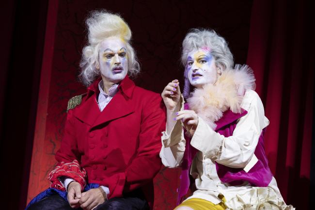 Wie weit darf man gehen, um einen guten Staat zu bauen? Diese Frage stellt Büchner in seinem Text und Mayr macht ihn zu einem Bühnenstück, das immer neue Vorhänge des Denkens und der Perspektiven aufzieht und wieder schließt. Dazu kommen die Protagonisten wie reichlich lädierte Rokoko-Wesen daher. Alle sind mit zusammengestückelten bunten Versatzstücken der damaligen Mode ausgestattet. Zusätzlich mit allerlei Farbklecksen versehen, selbst ihre Gesichter und Federperücken sind bunt bekleckst. Sie sind noch geprägt von ihrer Zeit, doch nichts passt mehr zusammen. Hier fehlt ein Ärmel, hier hängt die Rüsche an der falschen Stelle, hier passen die Strümpfe nicht zusammen. Das Chaos und die Wirren der Revolutionszeit sprechen aus ihren Kleidern. Einzig Robespierre hat etwas Ordnung in sein Outfit gebracht.