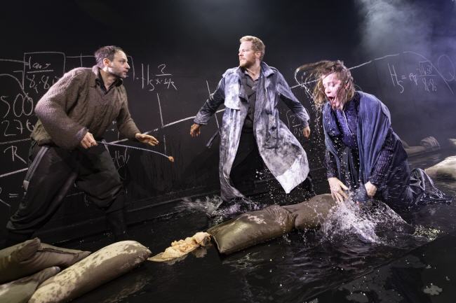 Gott gnaad de annern. Gott, verschone die anderen. Das schreibt Hauke zu Beginn mit einem Schwamm an die schwarze Wand. Dann tritt er zurück und steht mitten in einer breiten Wasserrinne, die fast den ganzen Bühnenraum ausfüllt. Er kniet sich hin. „Der Priel muss doch abzudichten sein.“ Doch dafür stehen ihm nur ein paar Sandsäcke zur Verfügung.