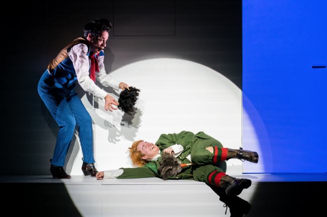 Das wird besonders deutlich, wenn sich zum Ende hin die weiße Bühnenwand wendet und die Rückwand mit ihren zig Regalfächern sichtbar wird. Nun kann man den Spielenden direkt beim Verkleiden zusehen, denn alle 15 Rollen werden von dem fünfköpfigen Ensemble gespielt. Nicht nur Titus wechselt also mit seiner Perücke ständig seine Rolle in der Gesellschaft, sondern auch alle anderen. Sandra Flubacher ist ein bräsiger Gärtnergehilfe, hochnäsiger Friseur und Titus’ schmierbäuchiger reicher Onkel. Oliver Mallison die exaltierte Kammerfrau und der unterwürfige Diener. Julian Greis ist die schüchterne, ebenfalls rothaarige und damit ausgestoßene Gänsehüterin Salome und die arrogante adlige Schlossherrin. Pascal Houdus ist zugleich die geblümte Gärtnerin, die pubertäre lispelnde Tochter Emma und der tatterige Notar. Kraft lässt sie alle zum Schluss so schnell zwischen den Figuren hin- und herspringen, dass keine Zeit zum Umziehen bleibt. So steht Houdus beim Wechseln zwischen seinen Rollen plötzlich ohne Unterhose da.