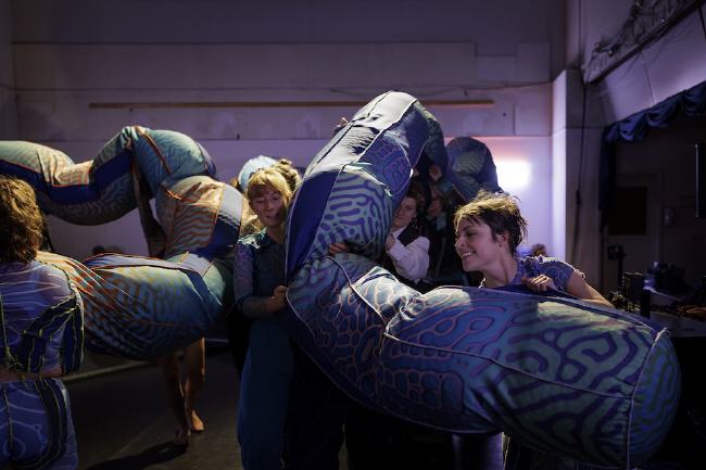 Der Raum in der Rentzelstraße, wo das Lichthoftheater eine noch im Werden befindliche Probebühne aufbaut, ist zu einem aquarischen Erlebnisraum geworden. Auf dem wasserfest ausgelegten Boden schlängeln sich riesige, blau gemusterte Stoffschlangen, die sich bis zu Sitzbergen auftürmen. Ein rechteckiges Wasserbassin aus dicker aufgewölbter Teichfolie erstreckt sich zu einer Wasserbahn. Über ihr hängt ein Beutel, aus dem ab und zu ein Tropfen in das Bassin fällt. Er schlägt konzentrische Kreise in das Becken, deren Muster von Scheinwerfern auf die Wände übertragen werden. Am unteren Ende steht ein Schlagzeug. Wassertropfen treffen zuerst sanft und vereinzelt auf die vier Trommeln, die unterschiedliche Tonhöhen wiedergeben. Dann erhöht sich das Tempo und ein Rhythmus wird erkennbar, bis er sich zur einer Komposition verdichtet. Vier Performerinnen in fantasievollen Wasserfallkostümen in Blautürkis-Tönen bewegen sich geschmeidig durch den Raum. Mit stummen Gesten fordern sie die Zuschauenden auf, sich an einer Wasserschlangen-Prozession zu beteiligen. So schlängeln sich die Stoffgebilde nun durch den Raum, um am Ende bequeme Sitzbänder für alle bereit zu halten.