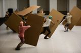 Drei rechteckige, mannshohe Pappen und flackernde Neonröhren – mehr ist auf der Bühne bei „Sider“ zunächst nicht zu sehen. Dennoch erzählt die Forsythe Company damit viele Geschichten um Ausgrenzung, Freiheit, Regulierung und Ausbruch. Die Pappen werden dabei zu wehrhaften Schilden, mit denen lautstark das eigene Terrain verteidigt wird. Mit ihnen werden Grenzen gezogen, anderen Beschränkungen der Einfaltung aufgedrängt und versucht sie unsichtbar zu machen. Doch in bunt gemusterten Ganzkörperanzügen inklusive Gesichtsmaske ist man ebenso möglicher Machthaber wie Revolutionär oder Terrorist. Schnell wechseln die Rollen innerhalb der bunten Gesellschaft. Häuser werden gebaut, in denen auf engsten Raum alle auszuharren haben. Rüttelt einer an den Regeln, fällt das Kartonhaus in sich zusammen. Ein paar Freigeister in Streetwear schwirren durch die Szenerie und versuchen sich nicht einkästeln zu lassen. Mit ihren katzenhaften Bewegungen, die gelenkig alle Freiräume zu nutzen verstehen, winden sie sich blitzschnell und anpassungsfähig zwischen den Grenzen hindurch.