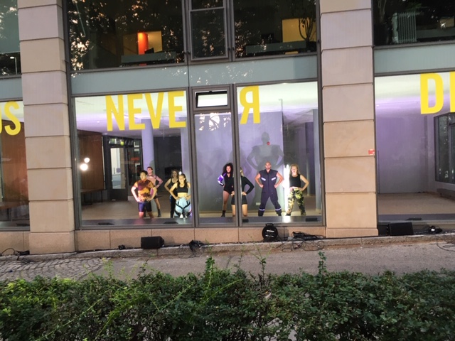 Direkt singen geht nicht. Also kommt die Stimme aus einer Box, die sie sich umschnallen. Das beschränkt nicht nur sondern erlaubt auch neue Möglichkeiten: Der folgende Kanon ertönt mit Stimmen wie von Mickey Mouse, Bruce Lee und anderen Comic- und Hollywood-Held*innen. So bilden sie mit ihren Slogans wie „Zusammen sind wir stark„ den Stimmenchor der letzten Zeit. Immer lauter und unverständlicher werden die Botschaften. Dann bricht das Stimmengewirr plötzlich ab und der Beat startet. Die Performer fangen an ihre Hüften zu shaken. Der Rhythmus macht alle Worte überflüssig und bringt sie alle in denselben Modus. Doc die kurze Phase der Gemeinschaft löst sich schnell wieder auf. Einer nach dem anderen verschwindet in den Innenraum des Kiosks. Nun teilen sie nicht mehr denselben Raum wie die Zuschauer*innen sondern sind durch eine Glasscheibe von den ihnen getrennt. Die Musik treibt sie zu immer neuen Tanzbewegungen an. Ihre Moves sind hektisch und selbstbezogen. Sie reiben sich an den Pfeilern, an den Scheiben, am Boden. Sie werden durchgerüttelt, doch bleiben auf Abstand. Tanzen ist zurzeit ebensowenig ein Gemeinschaftserlebnis wie Chorsingen.