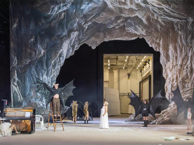 Es öffnet sich die Bühne nach hinten in den Requisitenraum. Holzgestelle sind zu sehen. Alles nur Show, natürlich! Es dauert noch einige Zeit, bis die vorbereiteten Felsen aus der Bühnenwerkstatt nach vorne gerollt werden und die beiden Mädchen in ihren rosafarbenen Kleidchen ihren Auftritt haben: „Complain with us!“, ist ihre Botschaft. Darüber können sich die Vampire nur vor Lachen ausschütten. Dennoch bildet sich bald darauf eine Beerdigungsgesellschaft zum Trauermarsch, die ihre Kreisbahnen zu einem von Lord Bayron verfassten Abgesang auf die Welt zieht. Was würden eigentlich die Fledermäuse zu diesen Vorgängen denken? Das ist die Frage, die die Gruppe danach umtreibt. Um sich ganz in diese hinein zu fühlen, werden sie kurzerhand alle zu einer. Und so endet der Abend mit einer Fledermauschoreographie.