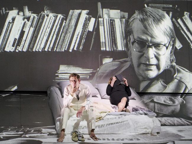 Bühnenbildner Jo Schramm hat ein raffiniert fiktives Bühnenbild geschaffen, in dem reale Möbelstücke in eine Videoprojektion gesetzt werden. Durch diese visuellen Mittel wird klar, dass alles nur ein Traum ist, in dem die Anteile der Realität verschwimmen. Zusätzlich lässt Regisseur Tom Kühnel dokumentarische Aufnahmen von historischen Personen auf die Rückwand einblenden, die ihre Kommentare oder Erläuterungen zu Hannah Arendts Biographie geben. Alle gespielt von den beiden Männern des Dreier-Ensembles. Da hat die Maske ganze Arbeit geleistet. Die beiden Darsteller sind kaum wieder zu erkennen. Kühnel verschränkt alles auf sehr intelligente Art, so dass er das Publikum mit Lemans Text in die emotionale Seite Hannah Arendts eintauchen lässt.