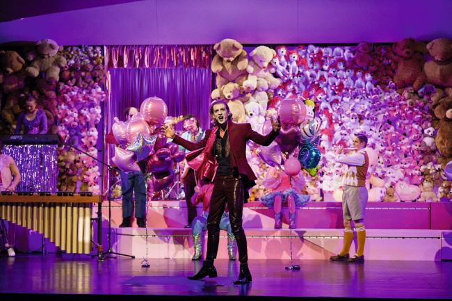 In Hamburg hat sich jede Inszenierung von Black Rider an der legendären von Robert Wilson am Thalia Theater zu messen. Obwohl sie schon 35 Jahre her ist. Doch in diese Falle tappt die Inszenierung von Georg Münzel nicht. Sie setzt auf einen ganz eigenen Ansatz. Im Gegensatz zu Wilsons Arbeit gibt es im Altonaer Theater keine schwarz-weiße Abstraktion, sondern eine quietschbunte Jahrmarktsatmosphäre zu sehen. Die Auftritte erfolgen durch Vorhänge aus lauter bunten Kuscheltieren. Der Wald besteht aus Bäumen von Luftballons. Die Live-Musiker:innen sind gleichzeitig Teil des Darstellerteams. Alle sind in türkis-pinke Kostüme gekleidet, die stets wie ihr Spiel zwischen Skurrilität und Klamauk changieren. So ist der Ton des Abends vorgegeben: Ganz ernst wird die Teufelsgeschichte hier nicht genommen werden.