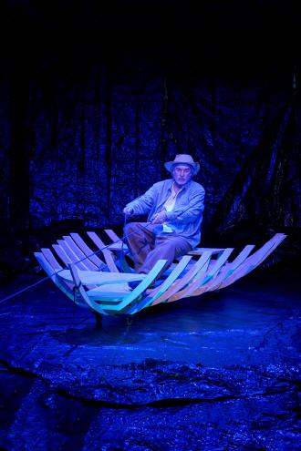 Die Umsetzung, die Regisseur Luca Zahn mit seinem Vater, dem Schauspieler Stefan Hallmayer, jetzt auf der Bühne des Altonaer Theaters zeigt, konzentriert sich ganz auf den Text von Ernest Hemingway. Inmitten von schwarzen Plastikplanen, die das Meer, den Wind, die Wellen und den Fisch darstellen können, steht ein hölzernes Bootskelett auf Rollen, in dem der alte Mann im Laufe seiner lebensgefährlichen Jagd über sein Tun und sein Leben nachdenkt. Je verzweifelter seine Lage wird, desto tiefschürfendere Fragen muss er sich stellen. „Es gibt niemanden, der es wert wäre, ihn zu essen, aufgrund seines Verhaltens und seiner großen Würde.“ Doch schließlich, er ist nur ein Fischer und das ist sein Beruf. „Ich weiß es nicht.“ Der Monolog von Hallmeyer zieht in seinen Bann. Das liegt nicht nur an seiner überzeugenden Darstellung des alten Mannes, sondern auch an dem immer noch beeindruckenden Text von Hemingway, der nichts von seiner Wirkungskraft verloren hat. In einfachen klaren Sätzen widmet er sich grundlegenden philosophischen Fragen des Menschseins, die berühren.