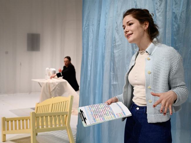 In der Mitte der komplett weißen Bühne sind in einer Ellipsenform Stoffbahnen aufgehängt. Sie können sich zu einem dicht geschlossenen Rund ziehen, sich Stück für Stück öffnen und auch Schicht um Schicht zu Boden sinken. In so einem Raum befindet sich Liv. Sie ist eine junge Frau, die ihr Leben wohl geordnet hat. Wie viel Mühe ihr das aber macht, wird erst nach und nach klar.