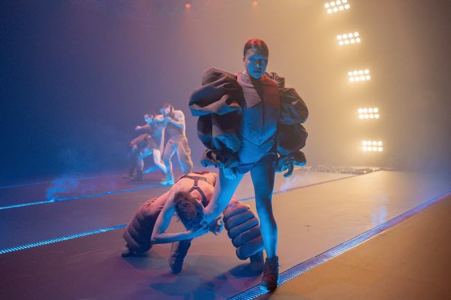 Düster ist die Bühne. Graue Platten liegen auf dem Boden, aus deren Zwischenräumen Rauch aufsteigt, der in orangenes Licht getaucht ist. Dazu ertönen flirrende, beunruhigende, unidentifizierbare Klänge. Eine Atmosphäre der Dystopie macht sich breit. Eine Frau stapft über das Terrain, in bauchfreiem Top zu einer Hose, die sich bis zum Boden wie übergroße Moonboots aufwölbt. Sie schreitet das Areal mit schweren Schritten wie bei einer Mondbegehung ab. Immer den Oberkörper hin- und herschwankend. Weitere Wesen, die ebenfalls an den unterschiedlichsten Stellen ihrer Kleidung seltsame Verdickungen aufweisen, gesellen sich zu ihr. Noch wagen sie die Kontaktaufnahme nicht; zu sehr sind sie mit der eigenen Erkundung beschäftigt. Die Klänge verändern sich, sie werden fordernder. Die Wesen haben nun einander wahrgenommen und scheinen zu diskutieren.